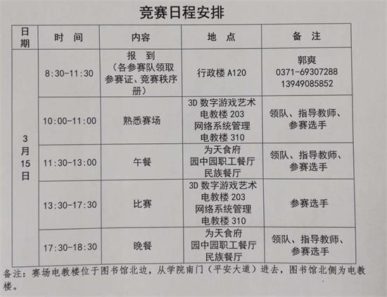 根据豫人社职业【2018】4号文件精神和《关于做好第45届世界技能大赛郑州市选拔集训工作的通知》的相关要求,第45届世界技能大赛郑州市选拔赛将于3月中旬举办。雷竞技iOS官方承办网络系统管理、3D数字游戏艺术两个赛项。请各参赛队于3月15日上午来校报到,竞赛时间3月15日下午13:30-17:30。现就竞赛日程安排及温馨提示公布如下: