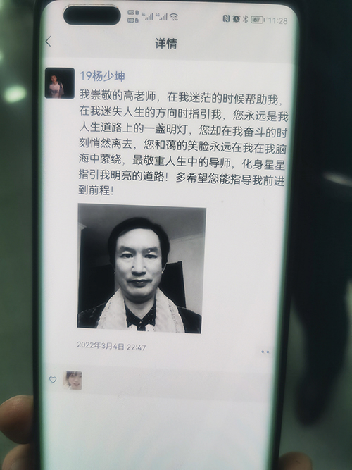 从指导学生专升本、考研,到帮助学生找工作,高金鑫一直把学生的事情放在首位。即使是在病床上,在生命的最后关头,高金鑫依然向前来看望的同事说:“我的那门课之后谁带呢?”春蚕到死丝方尽,蜡炬成灰泪始干,这句话是对高金鑫教书育人的最好注解。