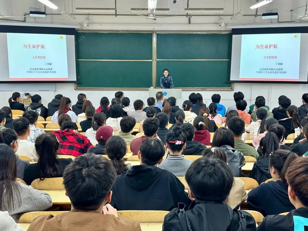 本次培训以“为生命护航”为主题,特邀中国红十字会应急救护培训师丁利娟进行授课。培训过程中,丁利娟就突发性晕厥、扭伤、骨折、皮肤擦伤、出血、气道异物梗阻、中毒、烧伤、踩踏等危险情况的急救措施进行了详细讲解。她还邀请同学们到台前进行模拟人实践,包括心肺复苏的标准姿势、AED的正确使用等,并现场演示了“8字包扎”“单侧胸部包扎”的正确手法。
