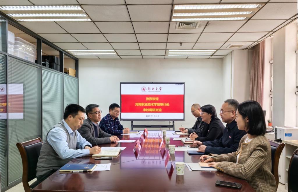 3月11日下午,学校审计处处长张首玉一行4人前往郑州大学,就内部审计工作开展交流学习。郑州大学审计处处长和俊民、副处长郭忠义、翟广星及相关科室负责同志参加交流座谈。